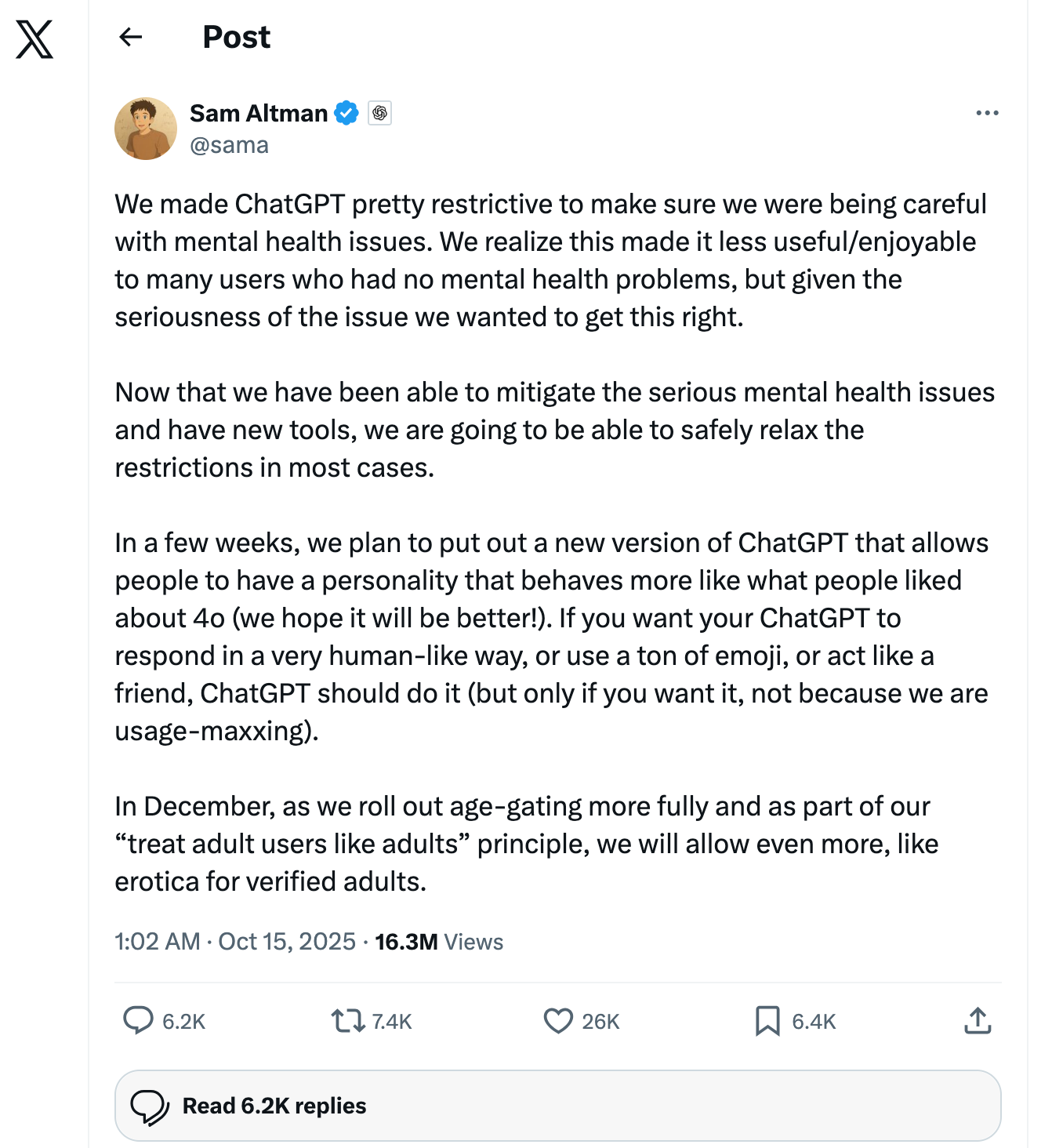 This week OpenAI announced that in December, they will allow ChatGPT to engage in erotic conversation with “verified adults”. Grok, the AI created by Elon Musk and his team, already has an NSFW version of it’s chatbot. Both Musk and Sam Altman, the CEO of OpenAI have said something along the lines of “we shouldn’t be the moral police, we should let adults be adults”.
