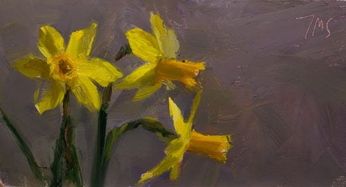 Back to our story. Narcissus, still unable to be with his reflection, is consumed by despair. He cries out in anguish and beats himself to death “with hands of marble”. When his sister nymphs find him, they go off to prepare a funeral pyre. But when they return they find no body, instead a single flower unlike any before. A narcissus, which we know as the daffodil, was standing where his body once lay with it’s head bowed toward the water.